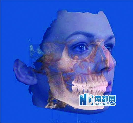 在电脑上先期做出的3D打印效果图,紫色、浅蓝色为缺损修复部分,边缘可打印出导板。